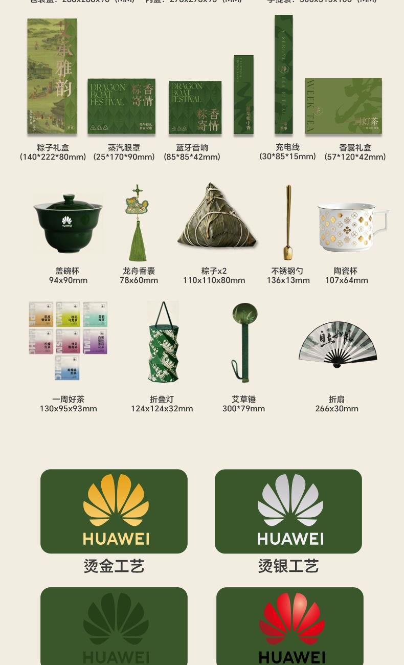 艾草锤:300*79mm.缎面刺绣 刺绣香囊:78x60mm.刺绣 折扇:266x30mm.绢布 盖碗茶:94x90mm.陶瓷(140ml) 大红袍:47x57mm.武夷山岩茶 粽子:157x128x93mm.真真老老240g 艾草锤配刺绣香囊折扇,盖碗泡大红袍双粽,风雅端午礼。 一锤一囊一扇一盖碗,双大红袍加双粽,国风心意满。 艾草锤捶走疲乏,刺绣香囊折扇添韵,盖碗茶双大红袍就双粽。